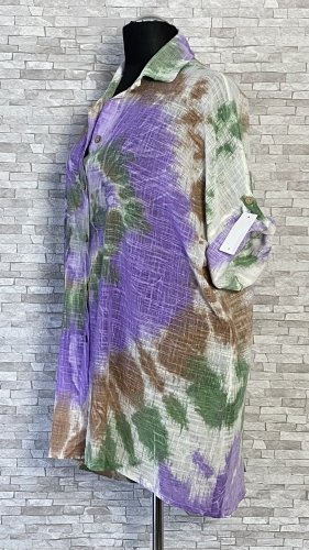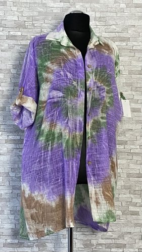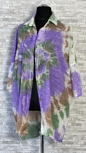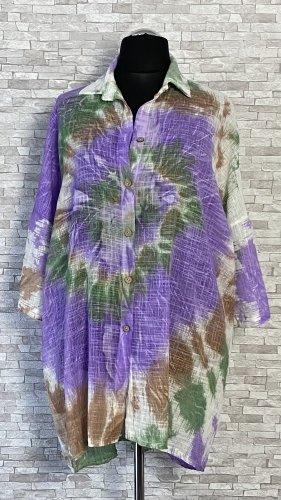 Rozpinana bluzka / koszula damska z kołnierzykiem, w cieniowane wzory na całości, uszyta z cienkiego i przewiewnego materiału bawełnianego.  Model