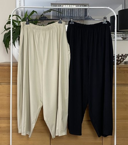 Długie, szerokie spodnie damskie, uszyte z wygodnego i przyjemnego w dotyku materiału bawełnianego ze stretchem. Model z pionowym, krytym szwem na obu nogawkach, z przodu i z tyłu. Spodnie z gumką w pasie i z przydatnymi kieszeniami po bokach, z kolekcji włoskiej marki Moonshine Fashion.
