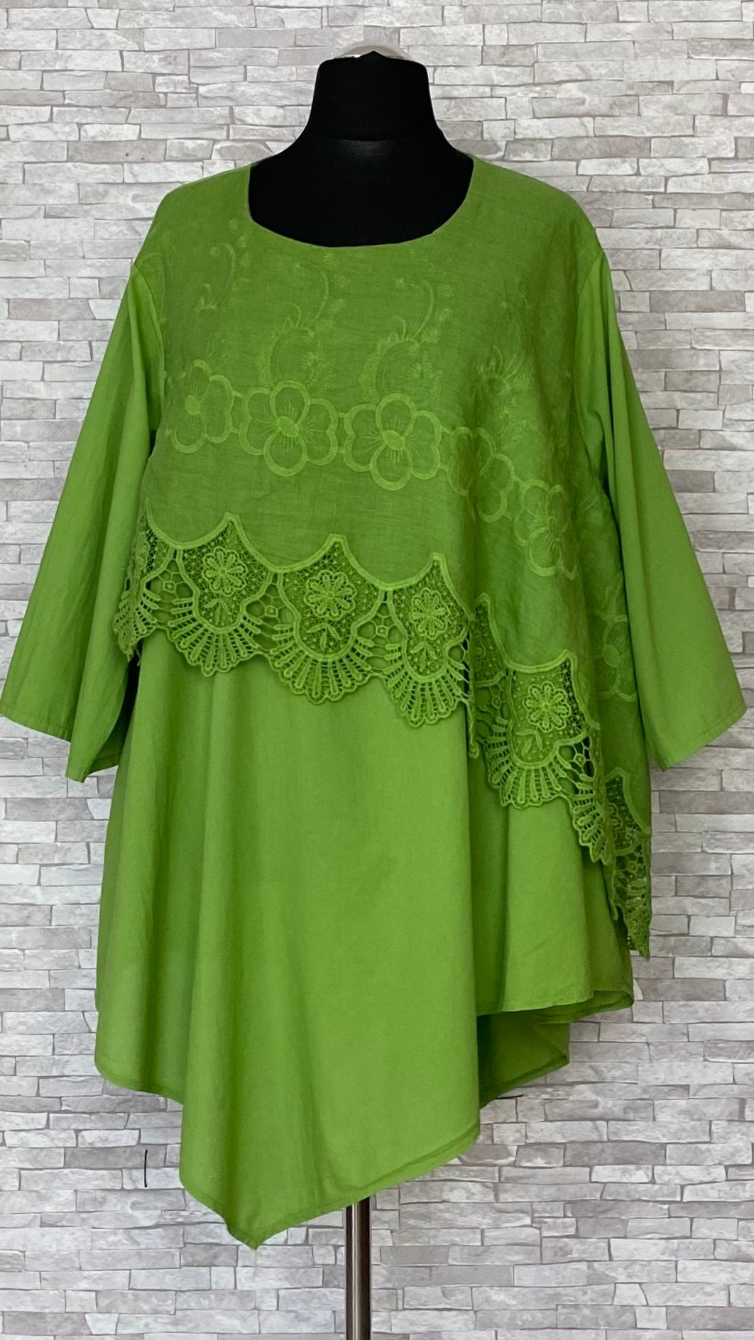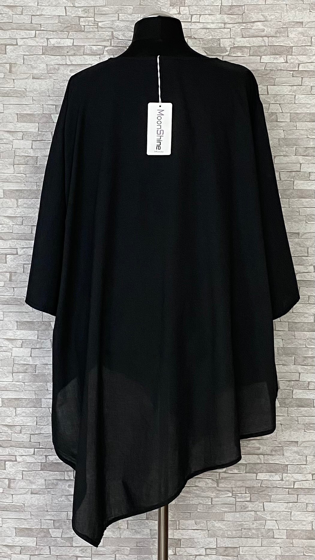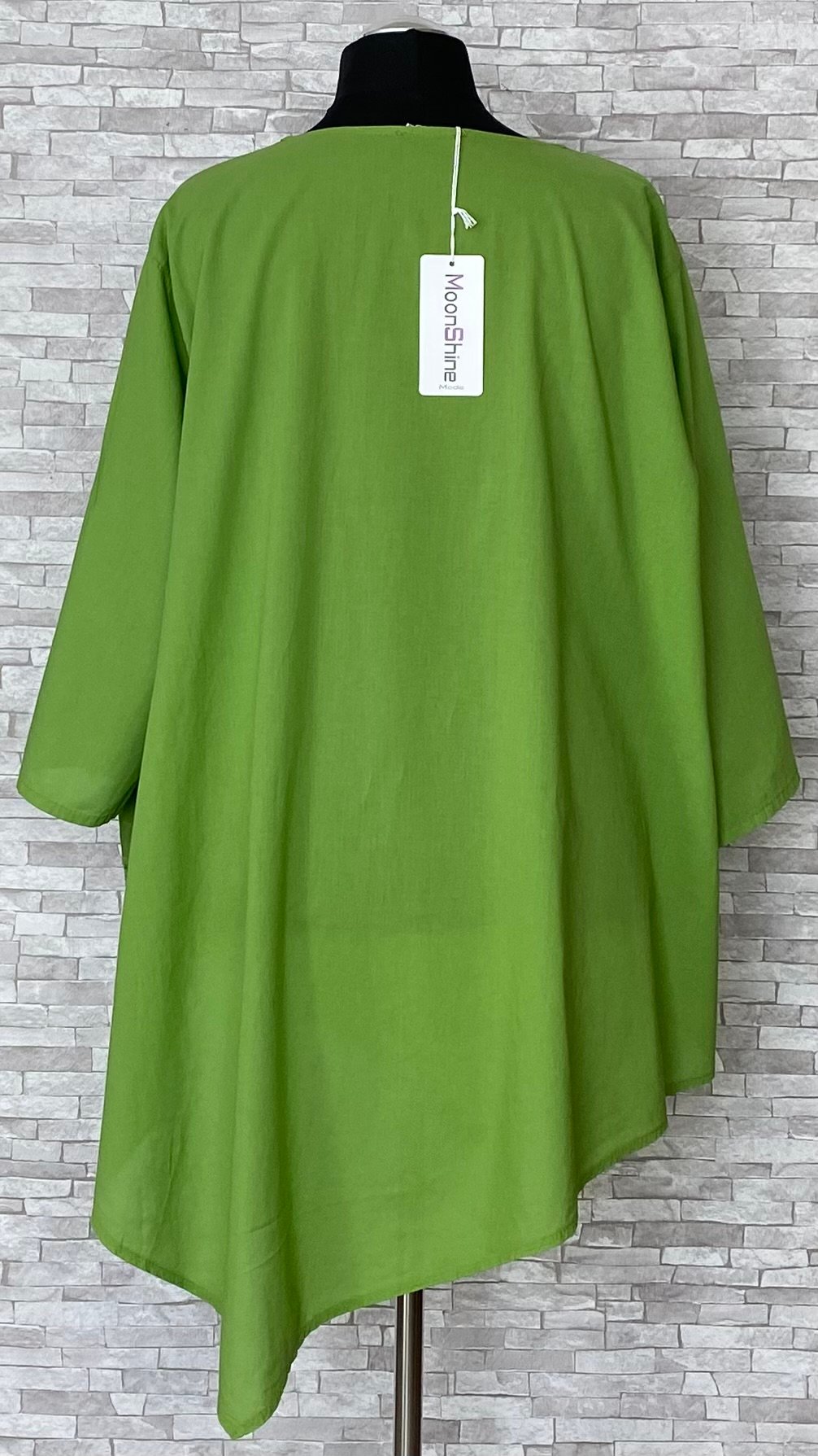 Tunika marki Moonshine Mode uszyta z cienkiego, przewiewnego materiału bawełnianego, zapewniającego lekkość i komfort noszenia. Model z półokrągłym dekoltem, asymetrycznym dołem oraz prostymi, szerokimi rękawami o długości 7/8. Przód tuniki jest podwójny – na bawełnianą warstwę została nałożona asymetryczna warstwa z naturalnego lnu (100%), ozdobiona haftowaną koronką, która nadaje całości oryginalnego i efektownego charakteru. Lekki, stylowy model idealny do codziennych stylizacji w cieplejsze dni.