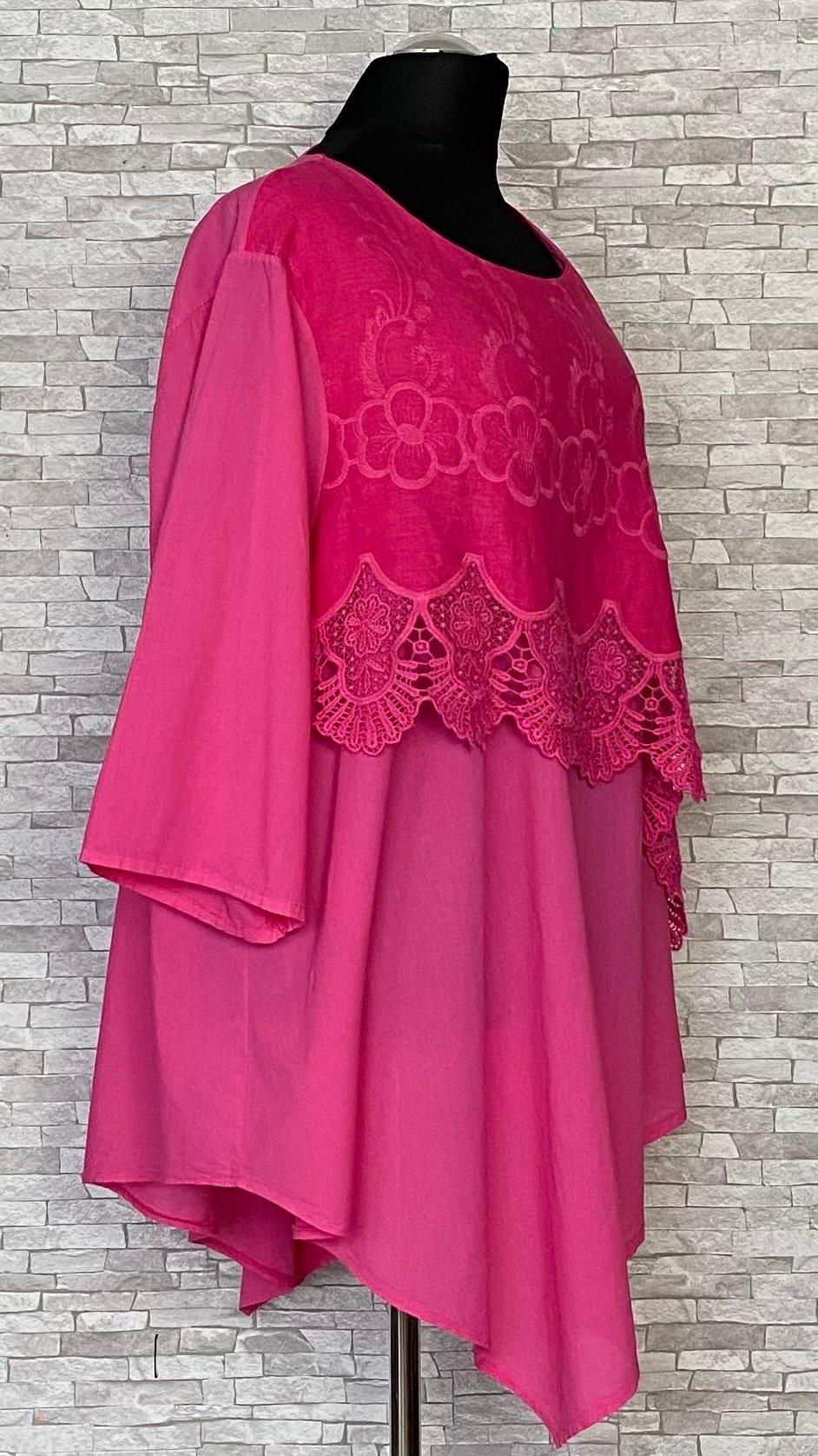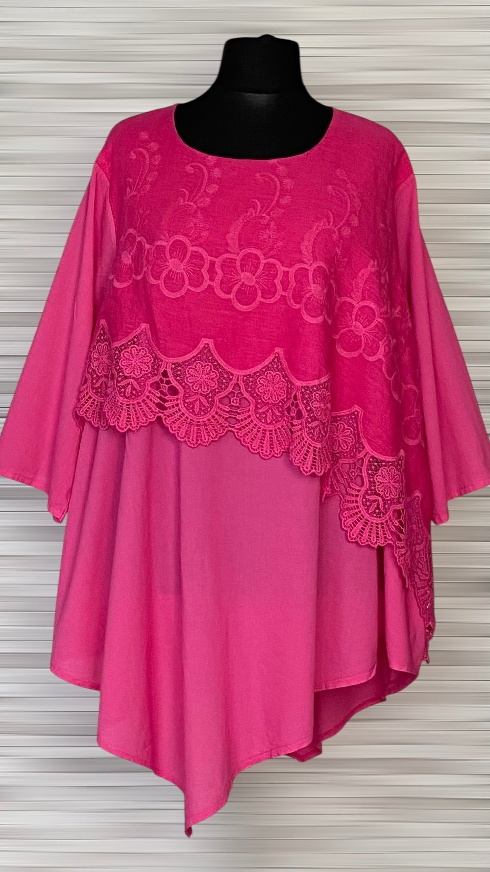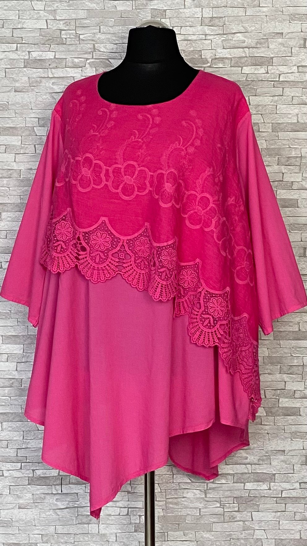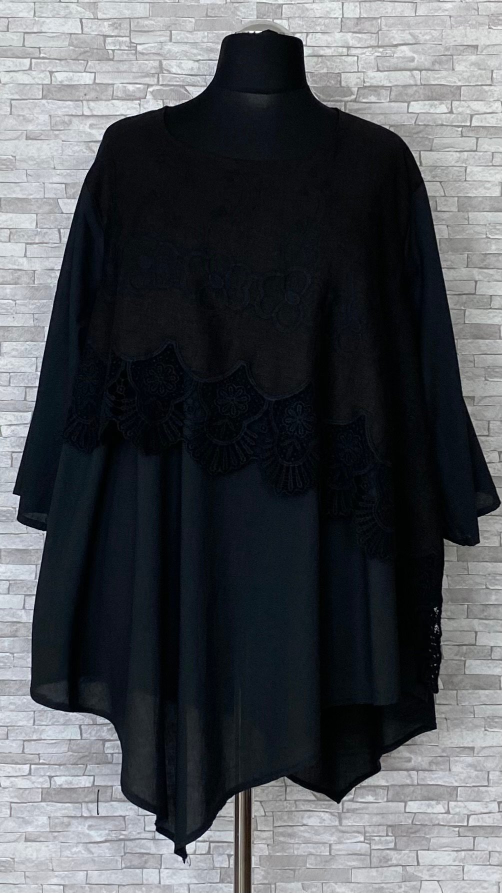Tunika marki Moonshine Mode uszyta z cienkiego, przewiewnego materiału bawełnianego, zapewniającego lekkość i komfort noszenia. Model z półokrągłym dekoltem, asymetrycznym dołem oraz prostymi, szerokimi rękawami o długości 7/8. Przód tuniki jest podwójny – na bawełnianą warstwę została nałożona asymetryczna warstwa z naturalnego lnu (100%), ozdobiona haftowaną koronką, która nadaje całości oryginalnego i efektownego charakteru. Lekki, stylowy model idealny do codziennych stylizacji w cieplejsze dni.