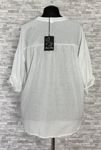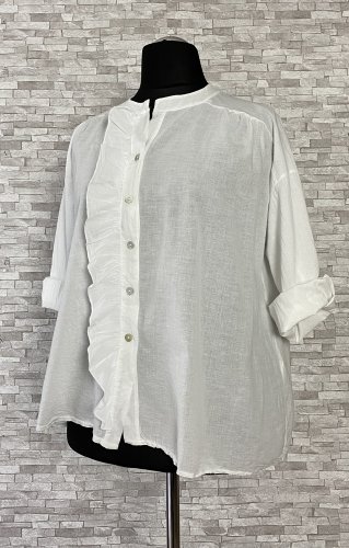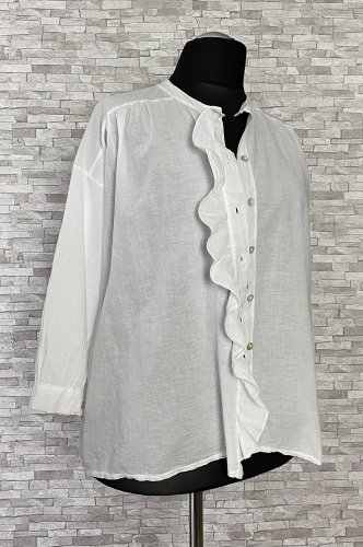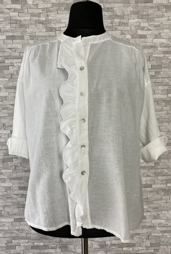 Rozpinana bluzka damska z falbaną po jednej stronie, uszyta z przewiewnego i przyjemnego w dotyku materiału wiskozowego. Rękawy długości 7/8, z obniżoną linią ramion, zakończone mankietem z zapięciem na guzik.