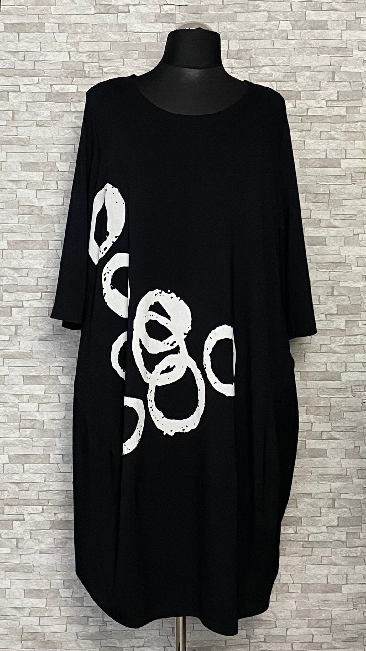 Efektowna sukienka marki New Jersey Fashion wykonana z wysokiej jakości materiału wiskozowego, który jest miękki, wygodny i elastyczny, zapewniając komfort noszenia przez cały dzień. Model w klasycznym, czarnym kolorze, ozdobiony na przodzie motywem białych, dekoracyjnych kół, które nadają całości nowoczesnego i wyrazistego charakteru. Sukienka posiada półokrągły dekolt, rękawy o długości 3/4 oraz praktyczne, wpuszczane kieszenie po bokach. Dodatkowym atutem są niewielkie poduszki na ramionach, które subtelnie podkreślają linię sylwetki. Balonowy krój zapewnia swobodę i oryginalne ułożenie materiału.