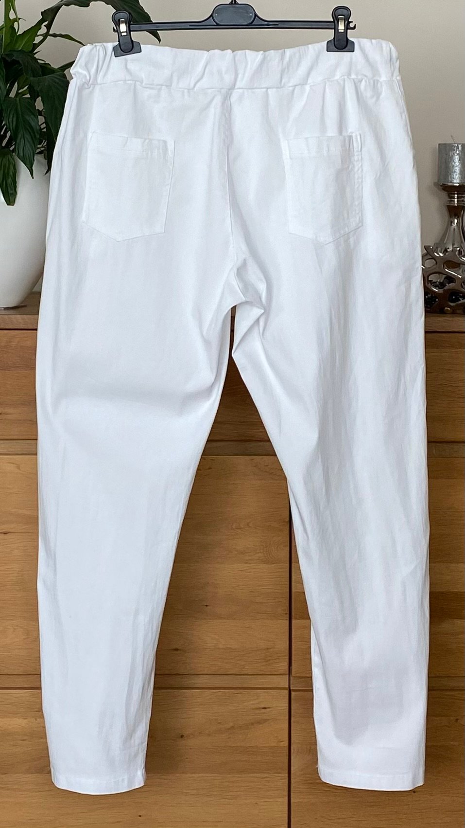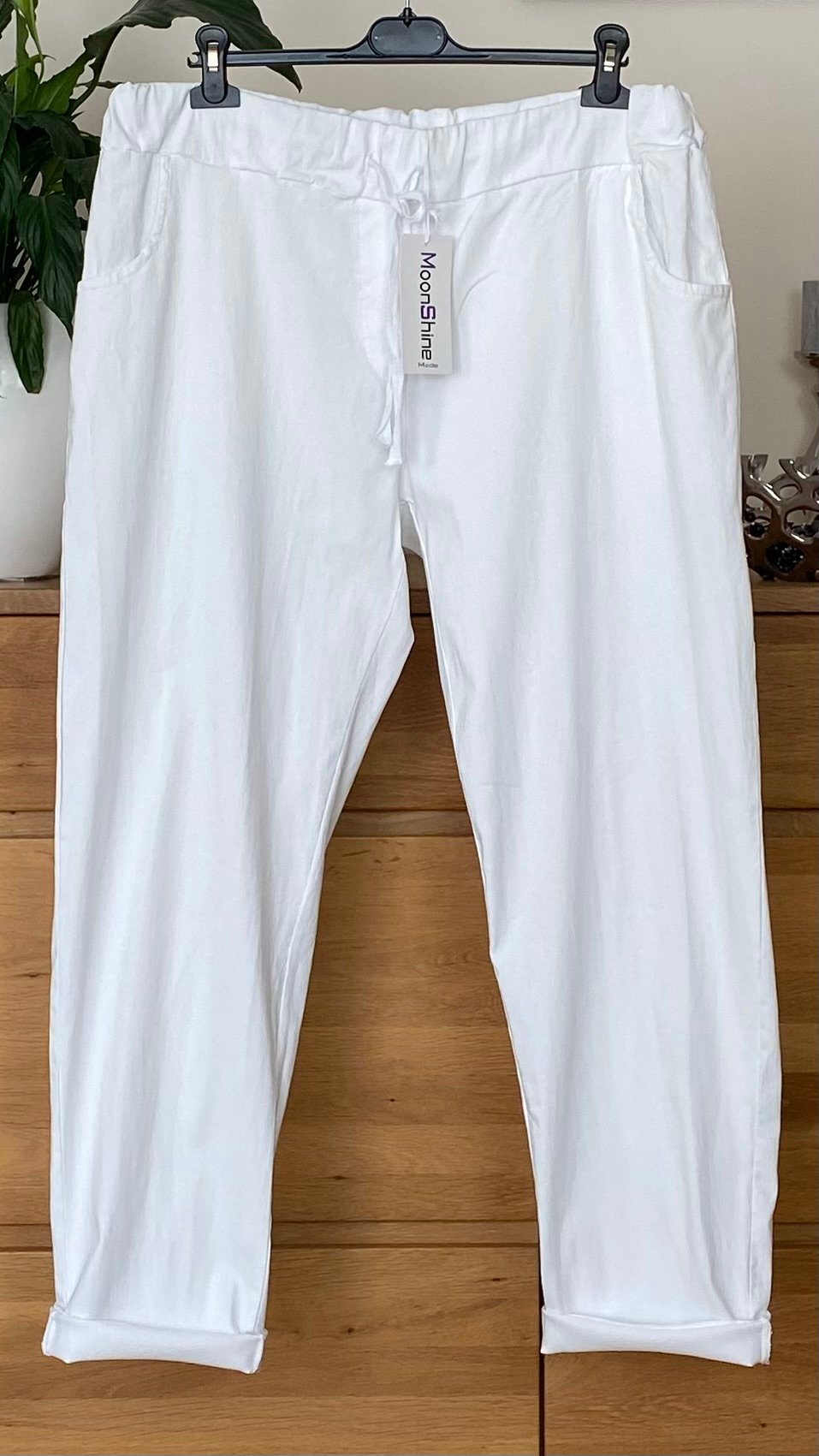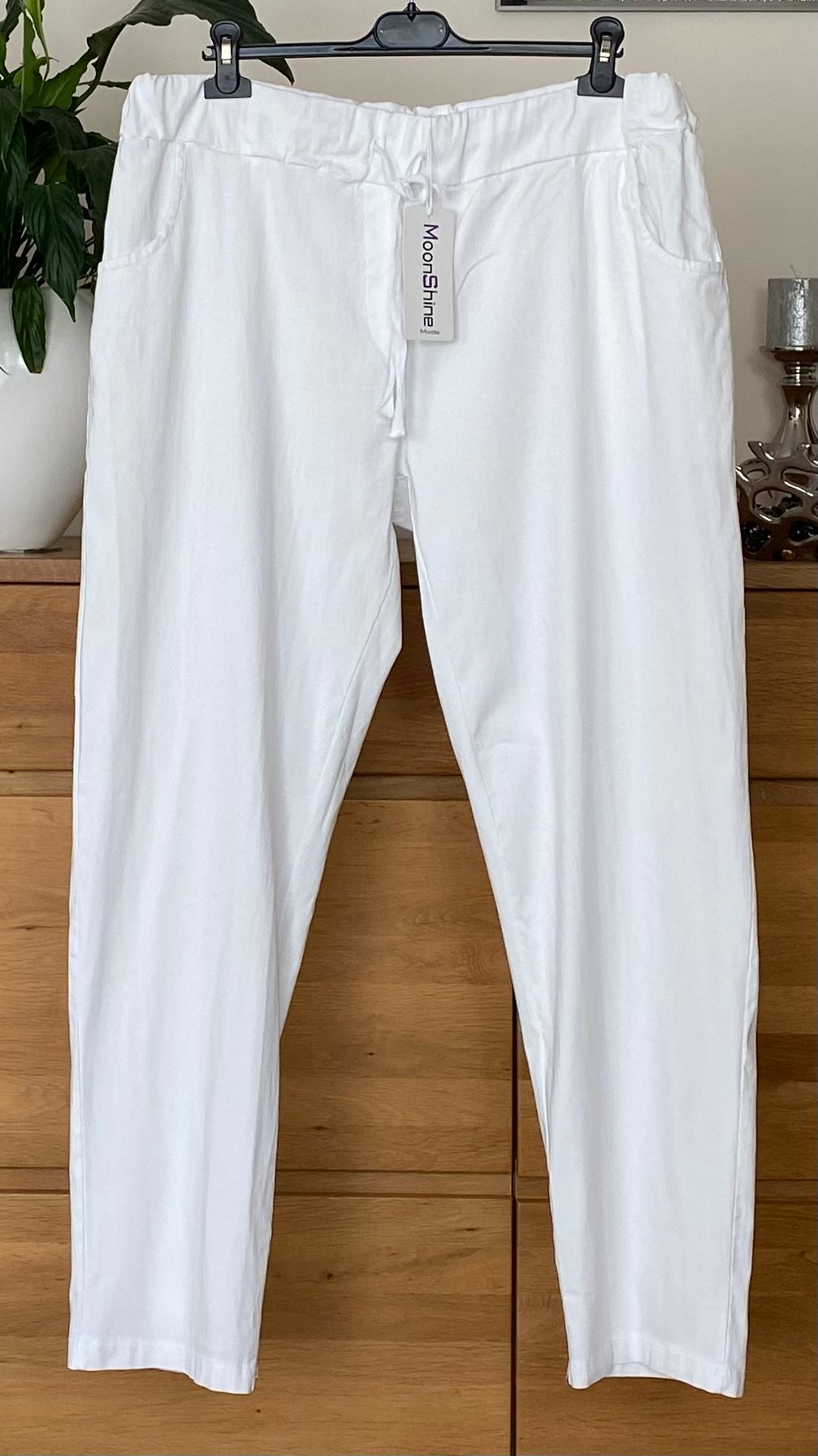 Białe spodnie Moonshine Fashion to połączenie komfortu, elastyczności i nowoczesnego designu. Wykonane z miękkiej tkaniny wiskozowej z domieszką nylonu i elastanu, zapewniają doskonałe dopasowanie i swobodę ruchów przez cały dzień. Model ma gumkę w pasie z troczkami, które pozwalają idealnie dopasować obwód oraz praktyczne kieszenie – po bokach i z tyłu. Delikatnie fakturowany materiał nadaje całości modnego charakteru.