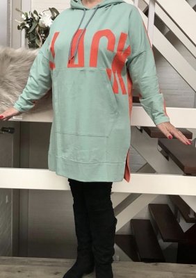 Bluza damska z kapturem ściąganym troczkami, wykonana z wygodnego materiału bawełnianego. Model luźny, z kieszenią typu kangur na przodzie. Rękawy długie, z obniżoną linią ramion. Na dole, po bokach niewielkie rozcięcia.