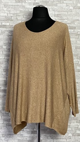 Sweter oversize z delikatnie dłuższym tyłem, z wygodnej i przyjemnej w dotyku dzianiny wiskozowej z domieszką wełny owczej. Model z półokrągłym dekoltem i długimi rękawami, z obniżoną linią ramion.