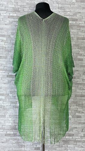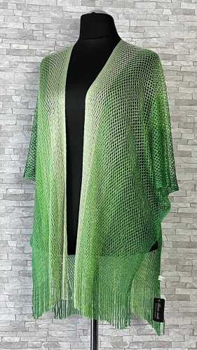 Efektowna narzutka w odcieniach zieleni, z niewielkimi rozcięciami po bokach. Niezapinany model z krótkimi rękawami i delikatnymi frędzlami na dole.