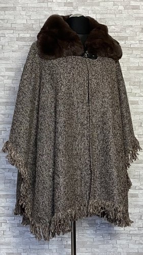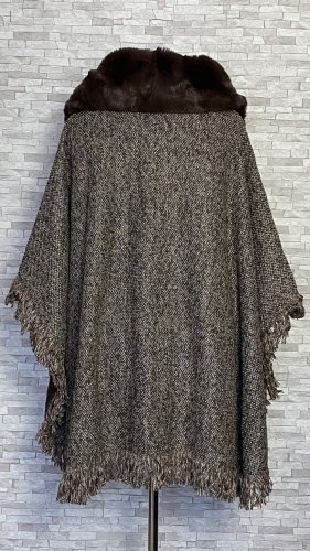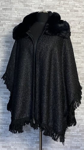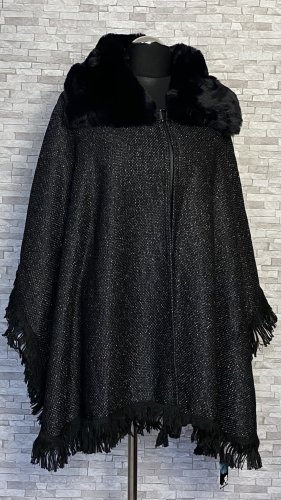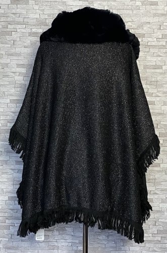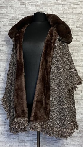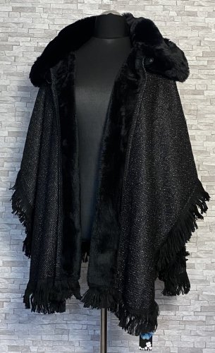 Eleganckie i ciepłe ponczo z futerkiem, idealne na chłodne dni jesieni i zimy. Model zapinany na zatrzask u góry, z miękkim futerkowym kołnierzem, który dodaje szyku i przytulności. Od spodu wykończone sztucznym futerkiem, z delikatnymi frędzlami na dole i po bokach.  Materiał wierzchni delikatnie połyskuje dzięki srebrnej nitce. Stylowa alternatywa dla klasycznego płaszcza – wygodne, efektowne i wyjątkowo kobiece.