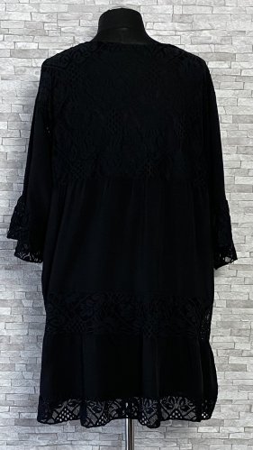 Efektowna tunika z koronkowymi wstawkami i dekoltem w szpic. Luźny model na podszewce, z szerokimi rękawami długości 3/4.