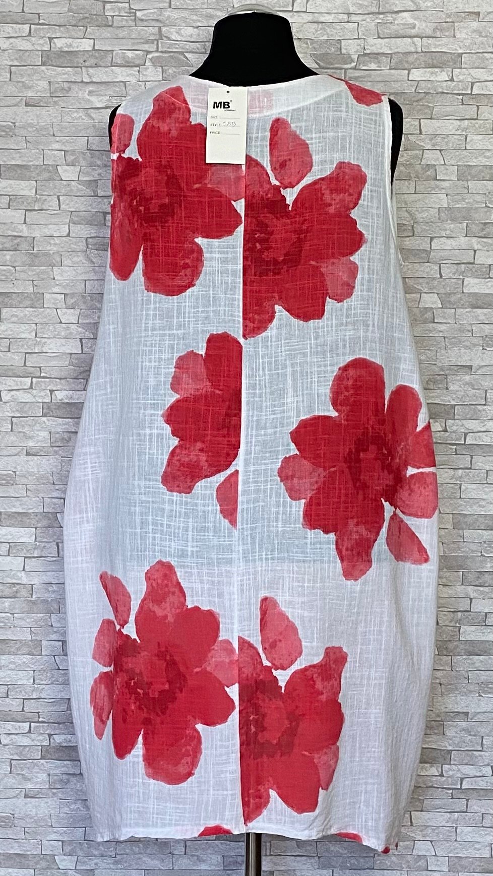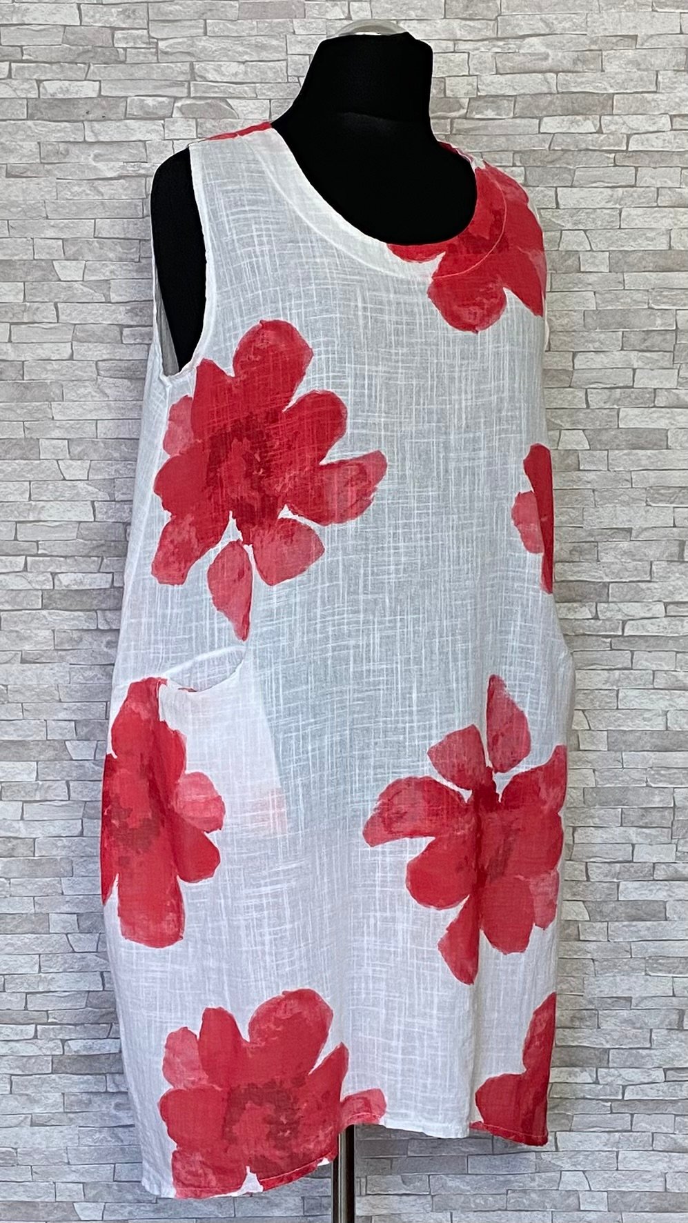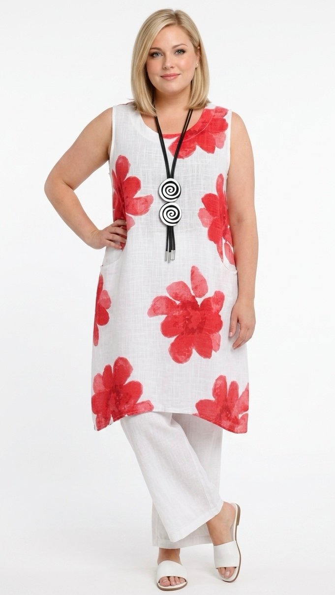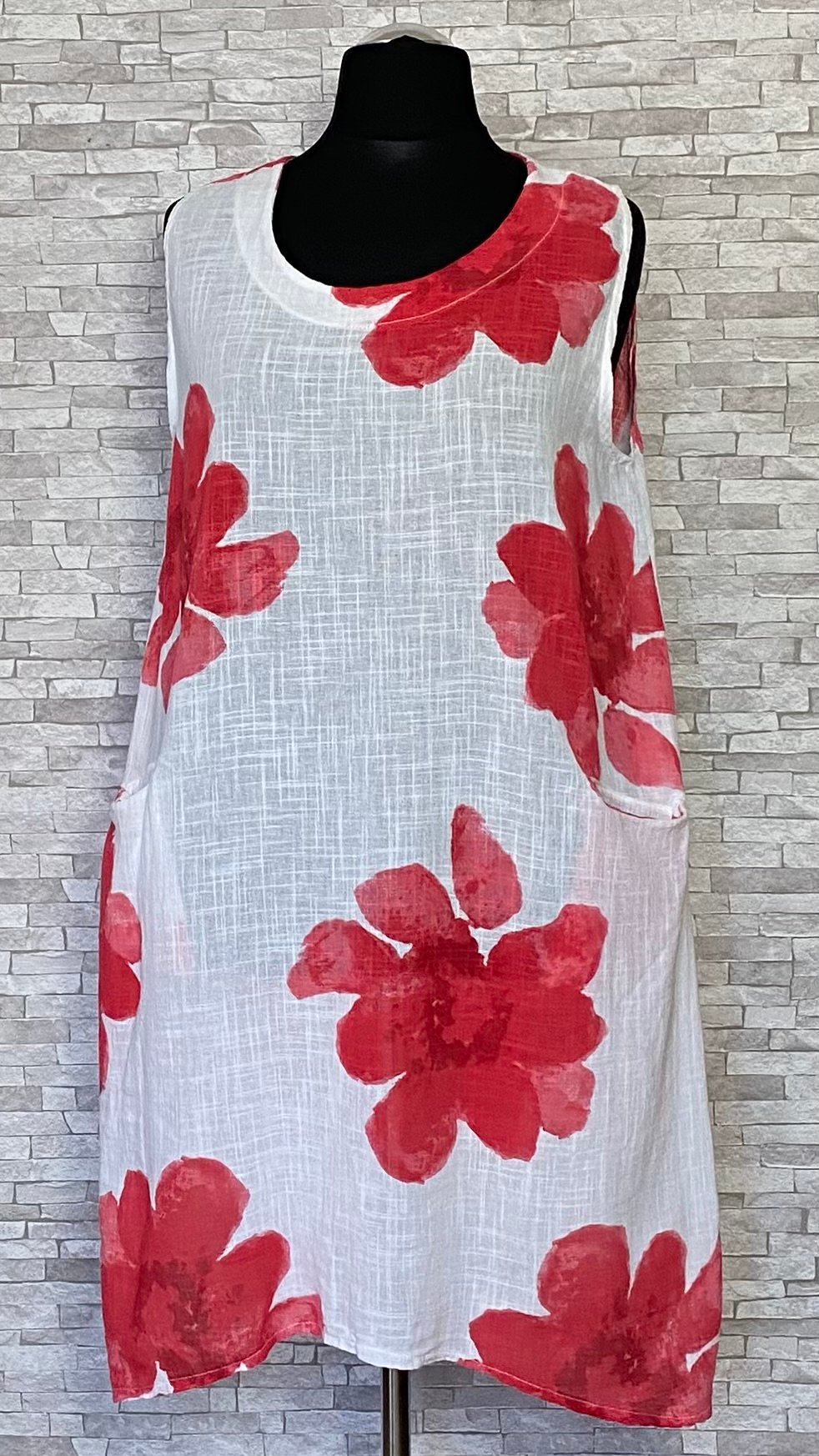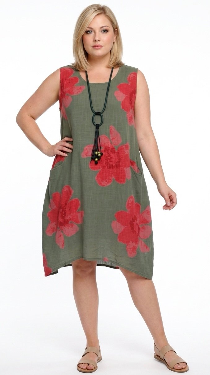 Letnia sukienka lniano-bawełniana marki MB Germany wykonana z przewiewnego i wygodnego materiału, idealnego na cieplejsze dni. Model bez rękawów, o swobodnym fasonie, zapewniającym komfort noszenia. Na przodzie znajdują się praktyczne kieszenie z wejściem od góry, które są wygodne w użytkowaniu i stanowią funkcjonalny detal. Całość zdobią efektowne, duże czerwone kwiaty na całej powierzchni, które nadają sukience wyrazistego, letniego charakteru. Lekka i stylowa propozycja na co dzień.