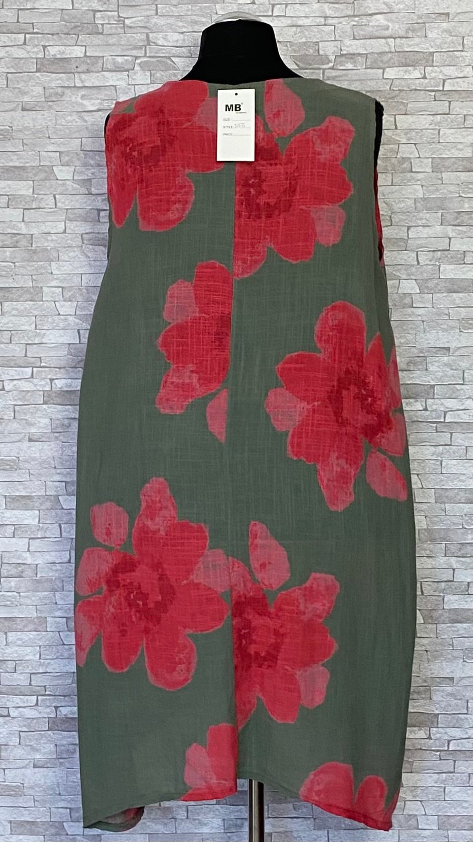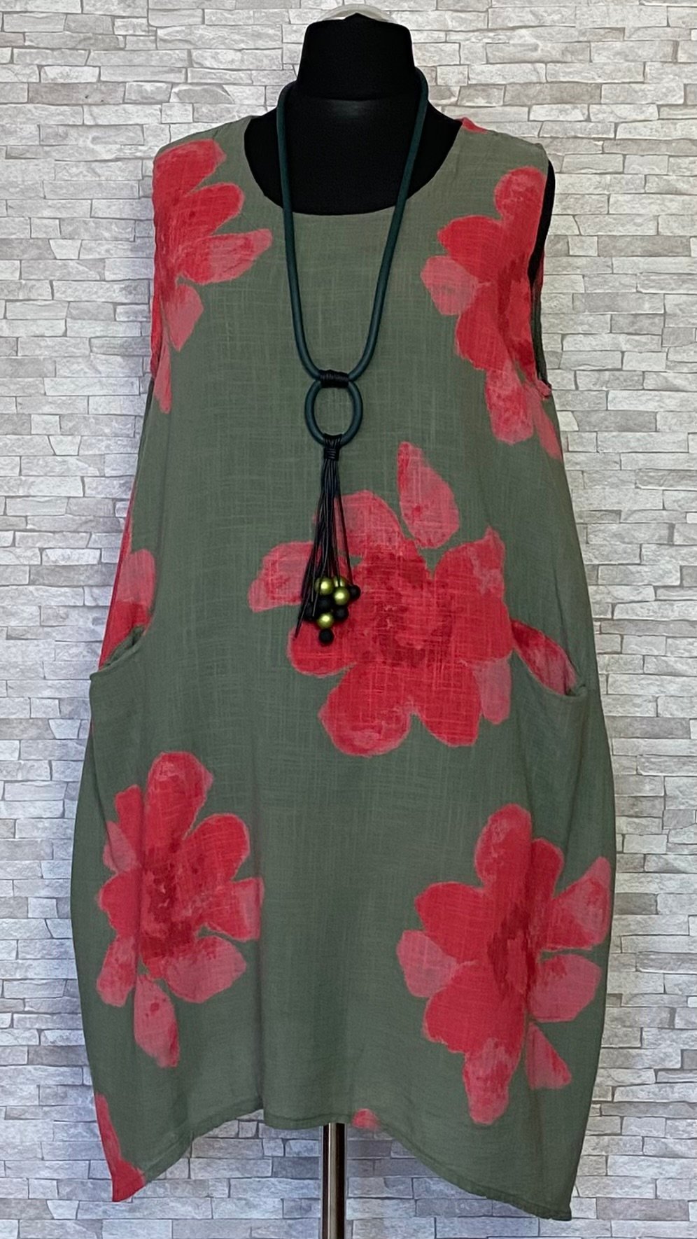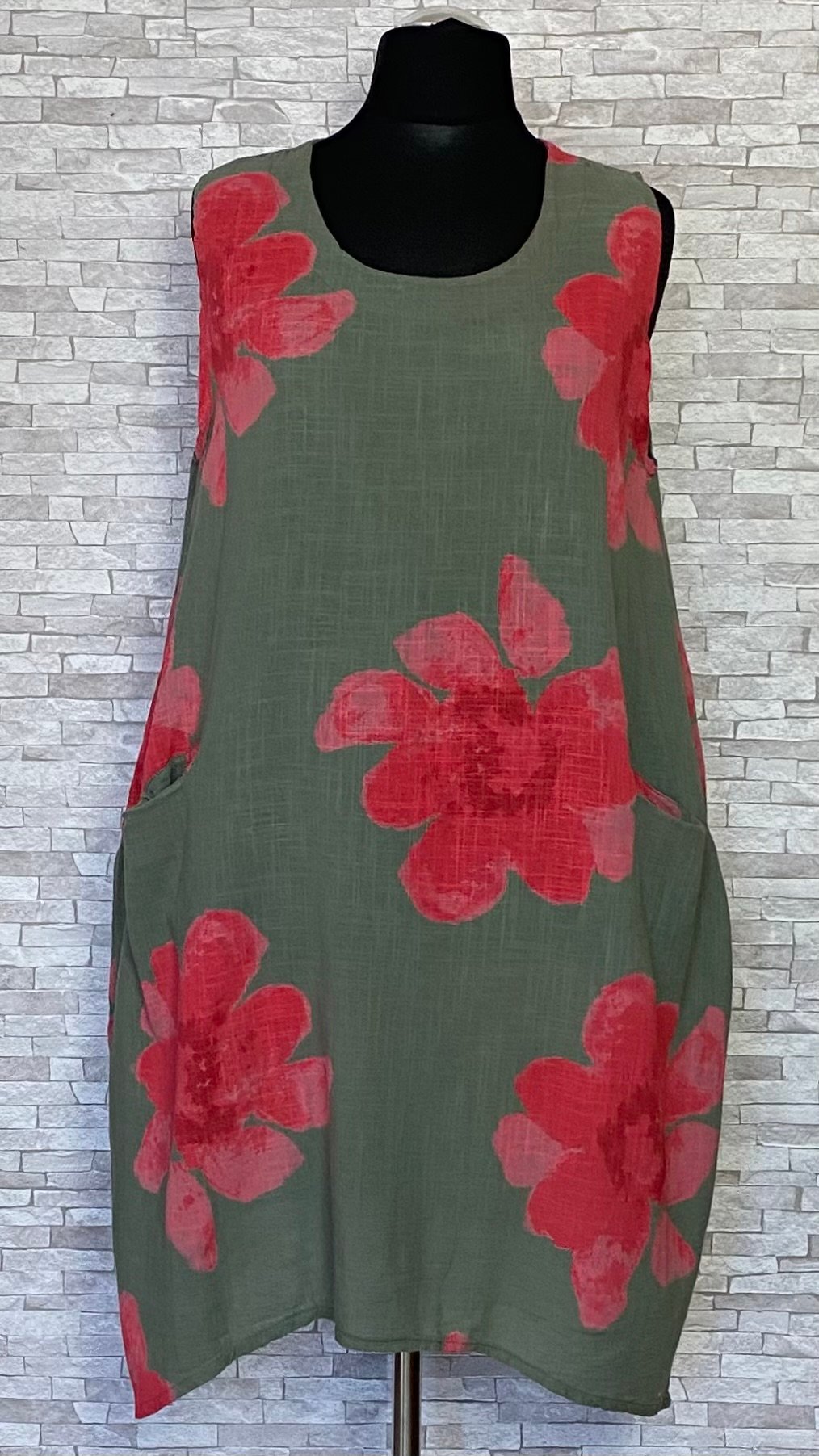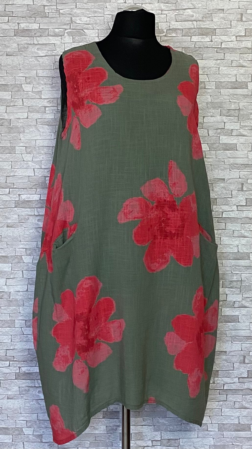 Letnia sukienka lniano-bawełniana marki MB Germany wykonana z przewiewnego i wygodnego materiału, idealnego na cieplejsze dni. Model bez rękawów, o swobodnym fasonie, zapewniającym komfort noszenia. Na przodzie znajdują się praktyczne kieszenie z wejściem od góry, które są wygodne w użytkowaniu i stanowią funkcjonalny detal. Całość zdobią efektowne, duże czerwone kwiaty na całej powierzchni, które nadają sukience wyrazistego, letniego charakteru. Lekka i stylowa propozycja na co dzień.