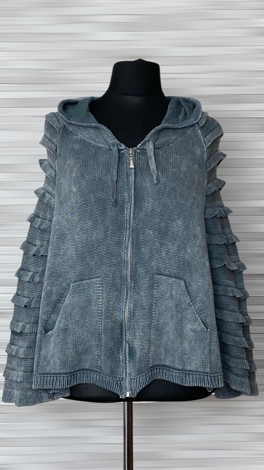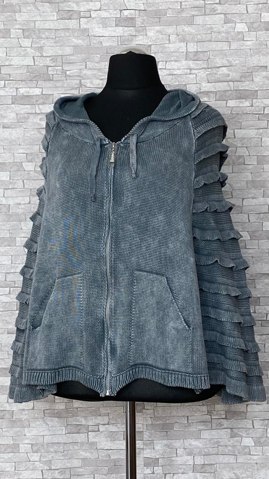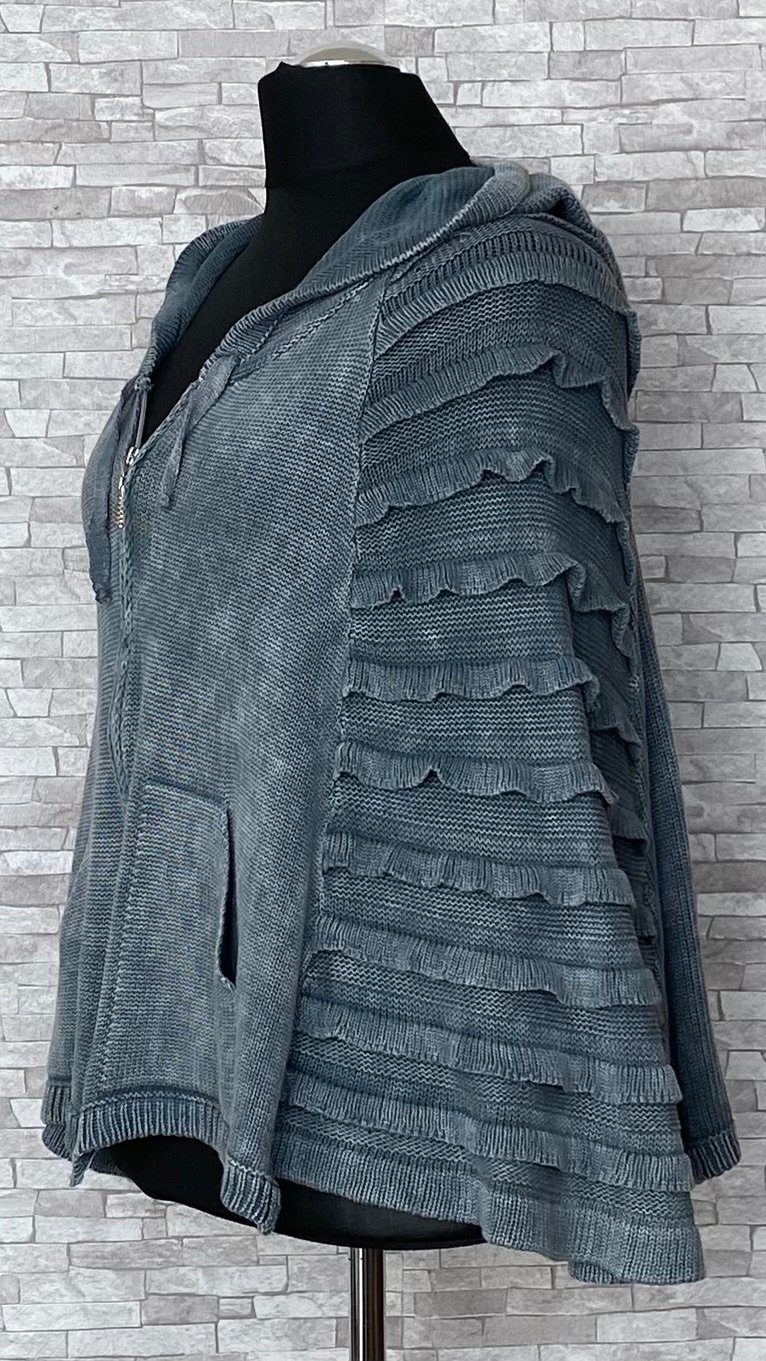 Narzutka marki KEKOO Design wykonana z wygodnej i przyjemnej w dotyku dzianiny, która zapewnia komfort noszenia i swobodę ruchów. Model zapinany na zamek, z praktycznym kapturem oraz kieszeniami na przodzie, które dodają funkcjonalności. Narzutka utrzymana w odcieniach niebieskiego, z efektownym, cieniowanym wybarwieniem (nierównomierne farbowanie nadaje jej unikatowego charakteru). Oryginalności dodają boki wykończone dzianinowymi zakładkami, które tworzą ciekawy efekt wizualny i podkreślają niepowtarzalny styl marki. Świetna propozycja do codziennych, swobodnych stylizacji.