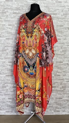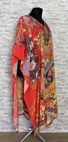 Ponczo / narzutka w oryginalne wzory, z cyrkoniowymi zdobieniami na przodzie. Luźny model z dekoltem w szpic, bez zszytych boków.