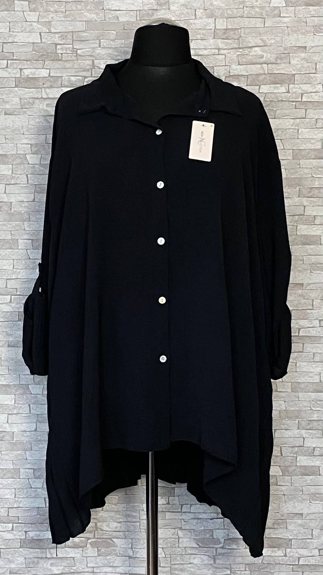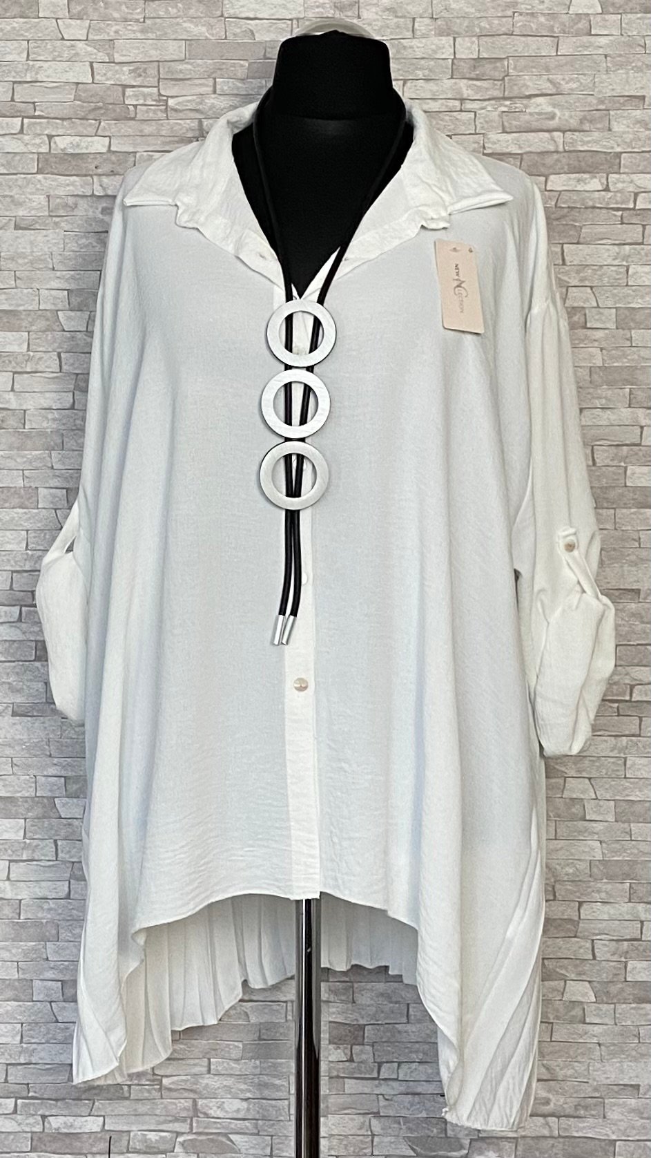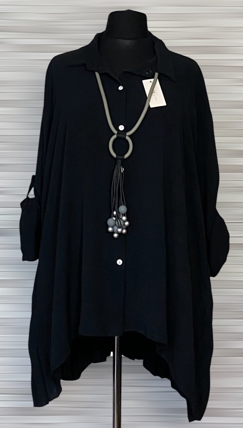 Tunika damska wykonana z miękkiego, wygodnego materiału wiskozowego. Rozpinany model o kroju litery A łączy swobodę noszenia z eleganckim charakterem. Tunika posiada kołnierzyk oraz efektowny, plisowany tył, który stanowi stylowy akcent i nadaje całości lekkości. Model z długimi rękawami z możliwością podpięcia oraz delikatnie dłuższym tyłem, idealny do codziennych i bardziej eleganckich stylizacji.