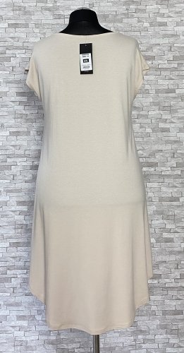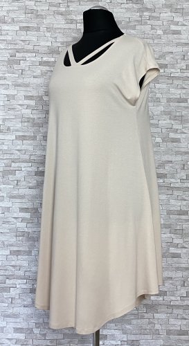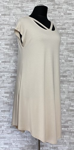 Rozkloszowana sukienka z dekoltem z materiałowymi paskami, przypominającymi literę V. Sukienka z krótkimi rękawkami i dołem o zaokrąglonej linii, co powoduje, że jest krótsza po bokach. Model z delikatnie dłuższym tyłem, uszyty z wygodnej i elastycznej dzianiny wiskozowej.