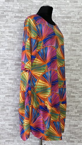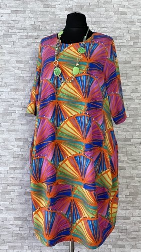 Sukienka w kolorowe wzory, z przydatnymi, wpuszczanymi kieszeniami po bokach, uszyta z wygodnego i miękkiego materiału wiskozowego, z domieszką poliestru i elastanu. Model o balonowym kroju, z rękawami długości 3/4. Sukienka z półokrągłym dekoltem i niewielkimi poduszkami na ramionach, z kolekcji marki New Jersey Fashion.