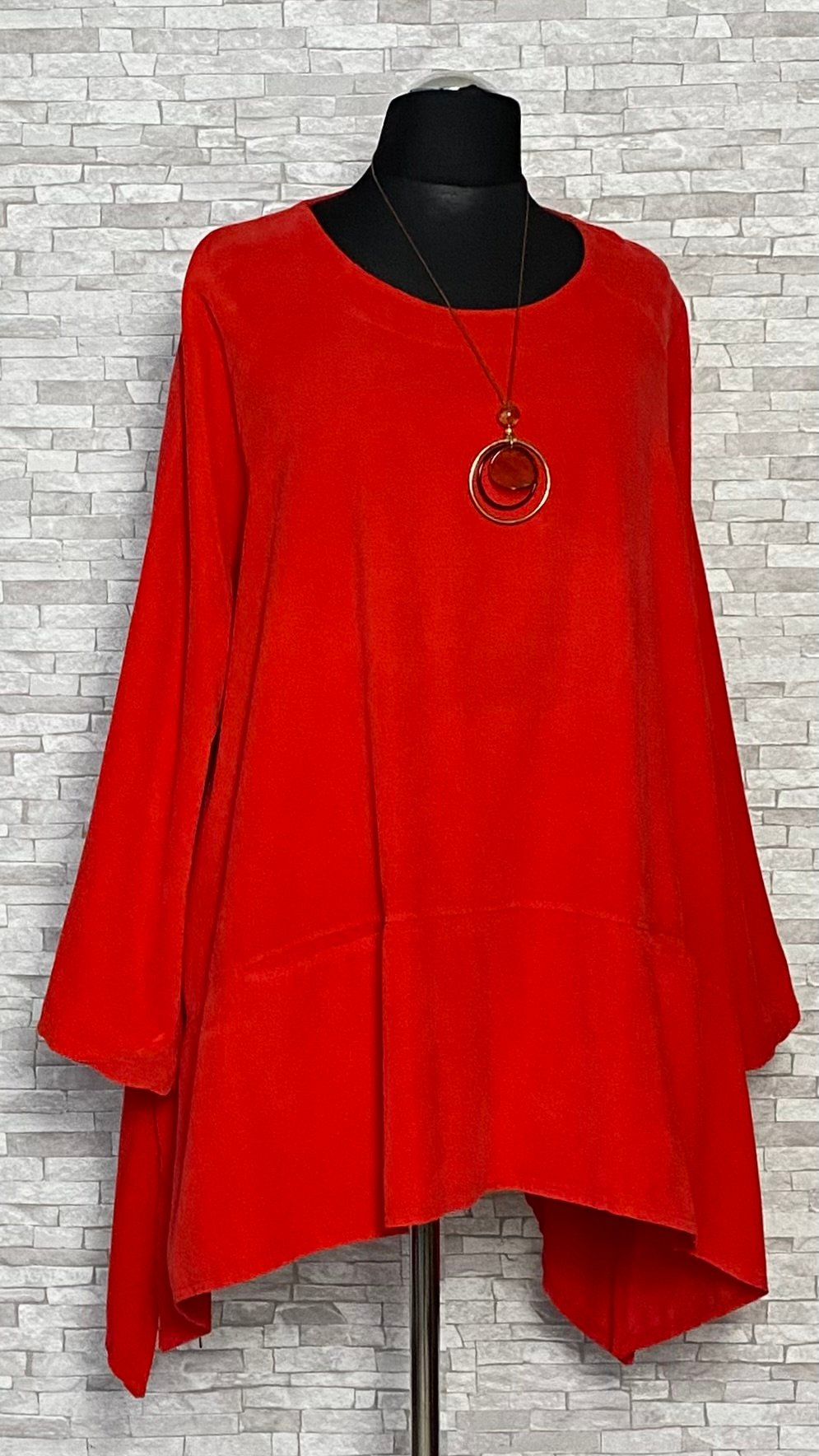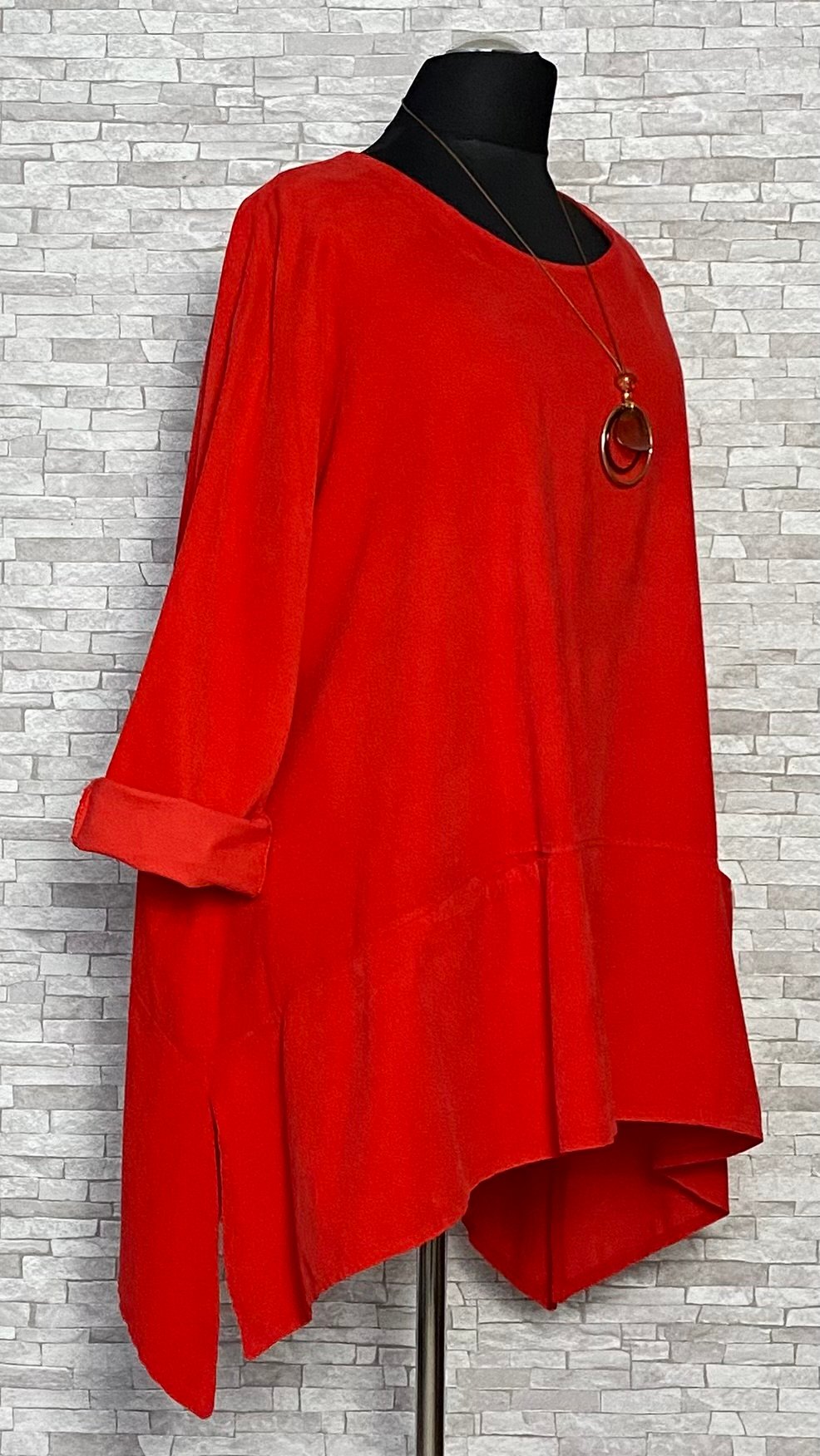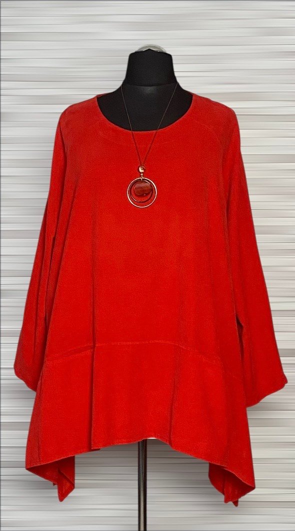 Stylowa tunika sztruksowa z cienkiego prążka, wykonana z miękkiej i wygodnej bawełny. Model w kolorze czerwonym, o kroju litery A, który swobodnie układa się na sylwetce. Tunika z praktycznymi kieszeniami wkładanymi od góry, długimi raglanowymi rękawami oraz półokrągłym dekoltem. Po bokach niewielkie rozcięcia zwiększające komfort noszenia. W komplecie ozdobny wisiorek, który dopełnia całość i nadaje stylizacji charakteru.