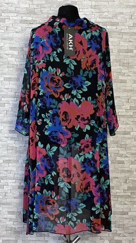 Czarna, elegancka koszula / tunika w kolorowe motywy kwiatowe, uszyta z cienkiego, prześwitującego i wysokiej jakości materiału. Model o kroju litery A, z kołnierzykiem i zapięciem na zamek. Tunika / koszula z przydatnymi kieszeniami na przodzie, z kolekcji marki AKH Fashion Germany.
