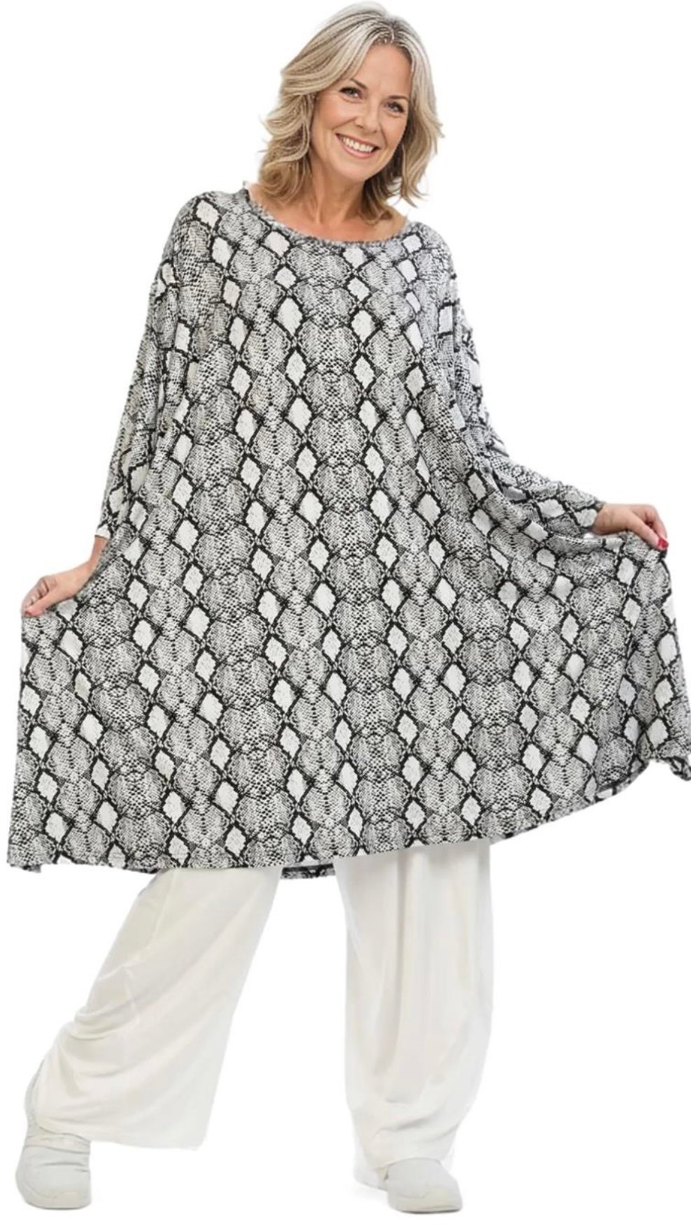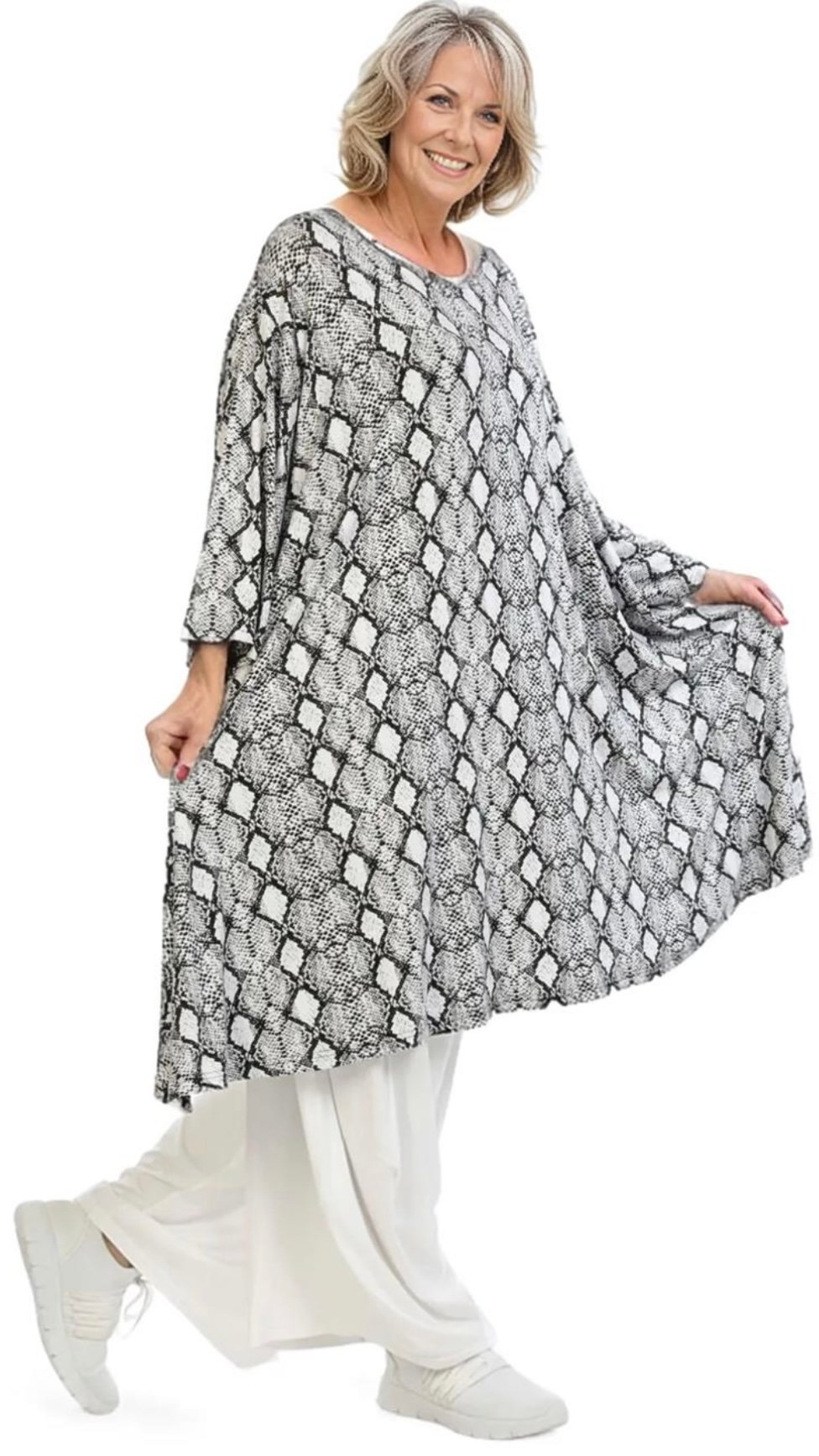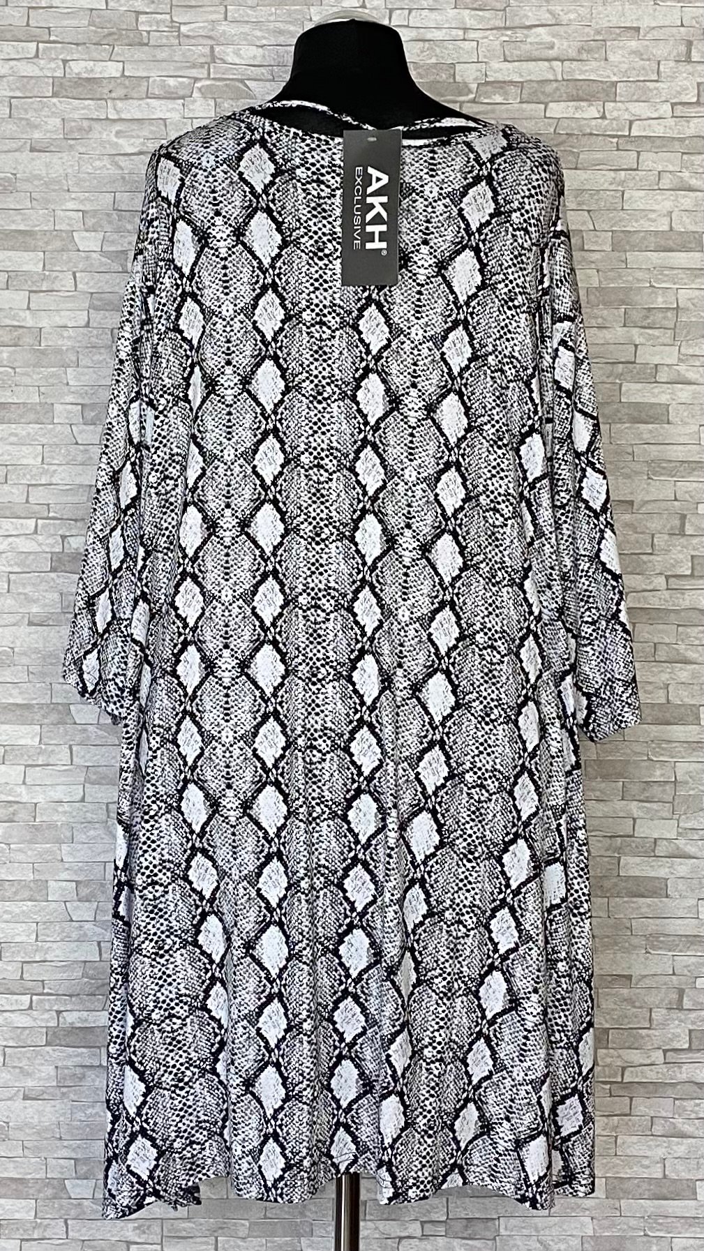 Tunika marki AKH Exclusive uszyta z wygodnego, elastycznego i wysokiej jakości materiału wiskozowego ze stretchem, który zapewnia komfort noszenia i dobrze układa się na sylwetce. Model o kroju litery A, delikatnie rozszerzany ku dołowi. Tunika posiada półokrągły dekolt oraz rękawy długości 7/8. Całość zdobiona wężowym wzorem w odcieniach czerni, bieli i szarości, który nadaje modelowi wyrazistego charakteru. Wygodna i stylowa propozycja do codziennych stylizacji.