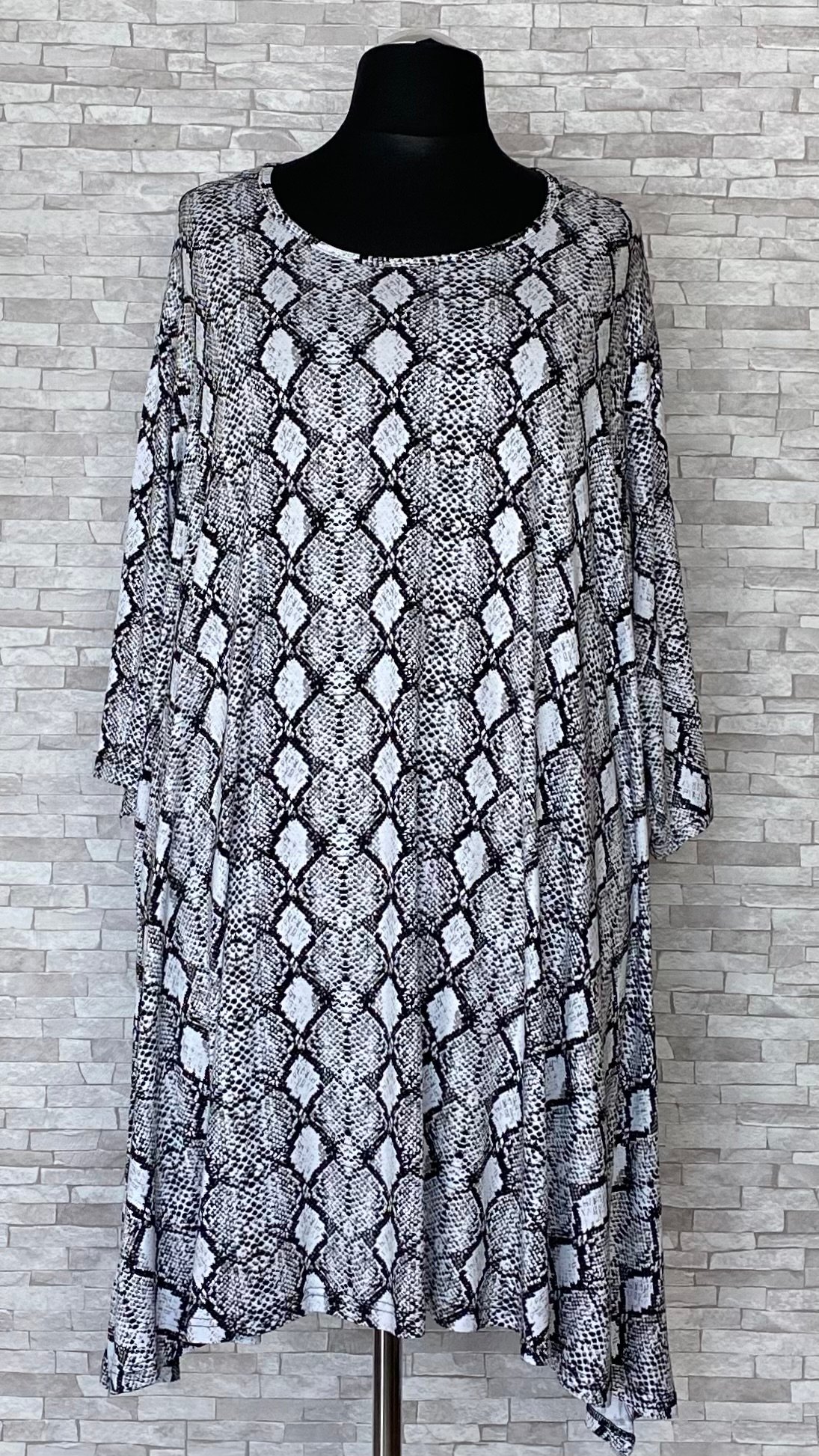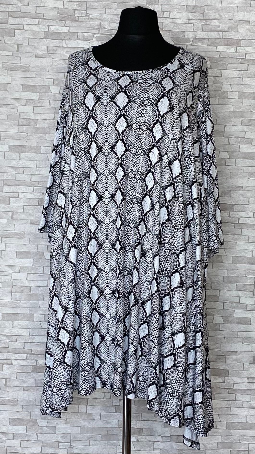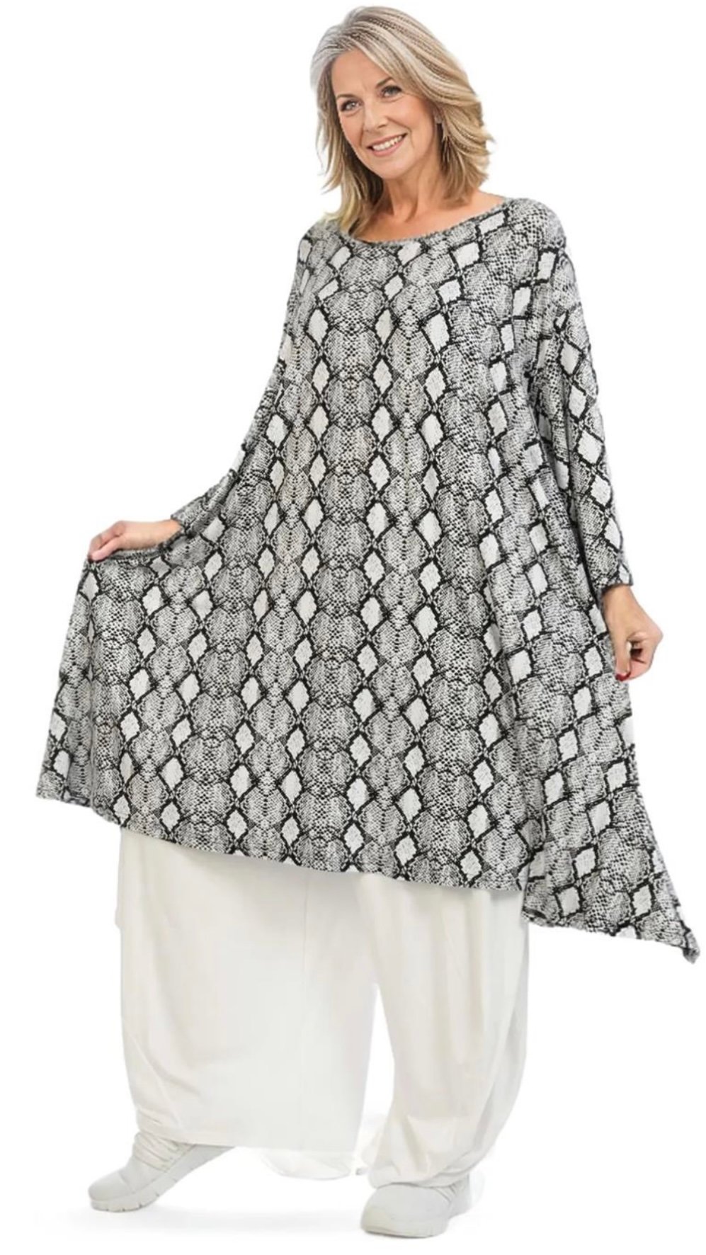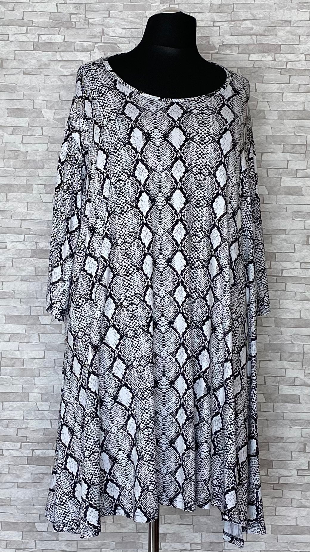 Tunika marki AKH Exclusive uszyta z wygodnego, elastycznego i wysokiej jakości materiału wiskozowego ze stretchem, który zapewnia komfort noszenia i dobrze układa się na sylwetce. Model o kroju litery A, delikatnie rozszerzany ku dołowi. Tunika posiada półokrągły dekolt oraz rękawy długości 7/8. Całość zdobiona wężowym wzorem w odcieniach czerni, bieli i szarości, który nadaje modelowi wyrazistego charakteru. Wygodna i stylowa propozycja do codziennych stylizacji.