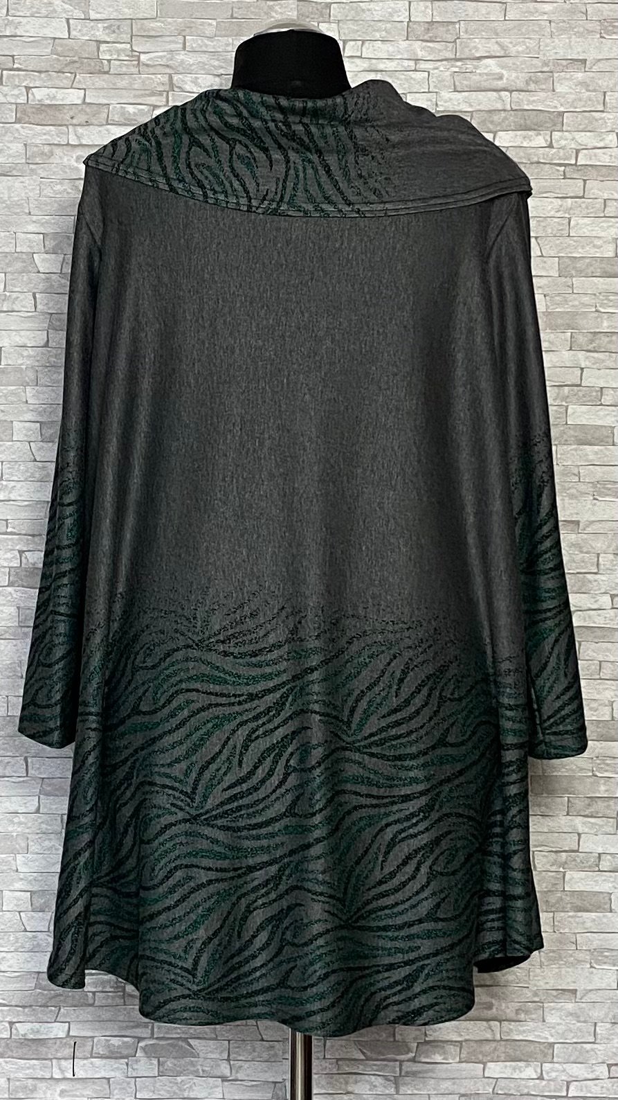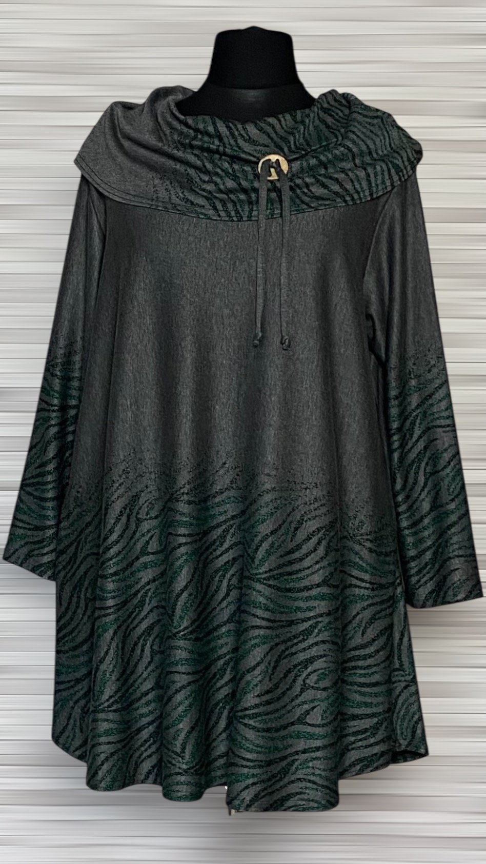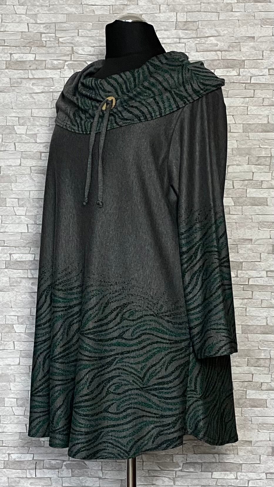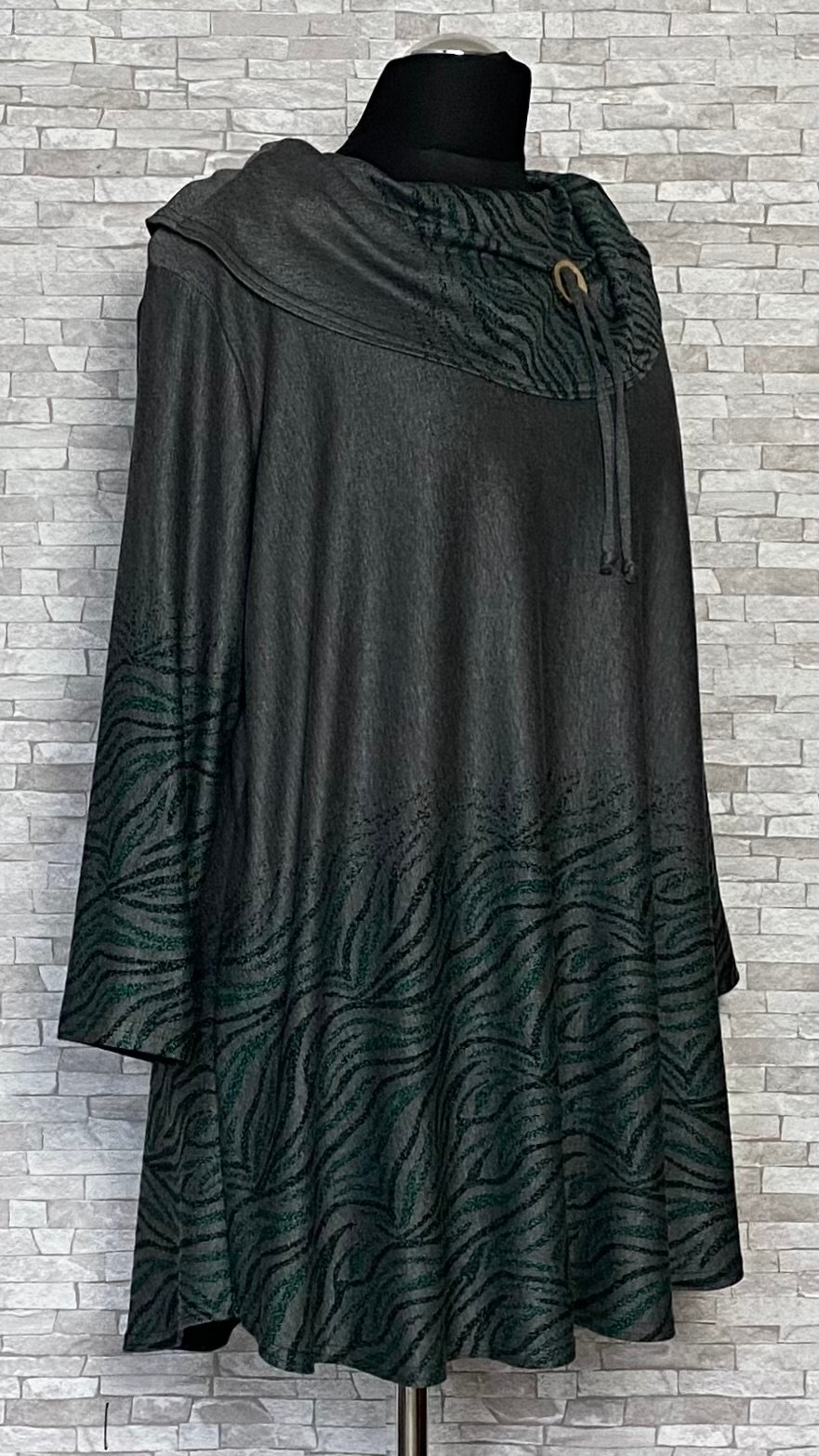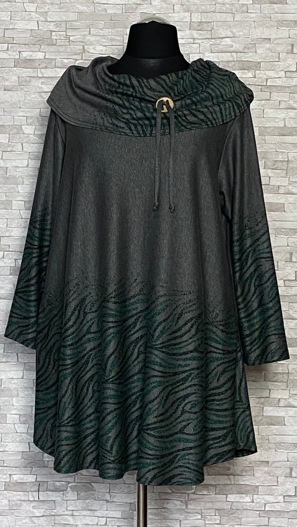 Tunika marki New Jersey Fashion uszyta z wygodnego i wysokiej jakości materiału. Model w szarym kolorze, ozdobiony subtelnymi zielono-czarnymi wzorami umieszczonymi na dole tuniki, na golfie oraz na rękawach. Tunika delikatnie rozszerzana ku dołowi, z luźno opadającym golfem, wyposażonym w ozdobny guzik i troczki, które stanowią stylowy detal. Model z długimi rękawami i niewielkimi poduszkami na ramionach, idealny do komfortowych, a jednocześnie efektownych stylizacji.