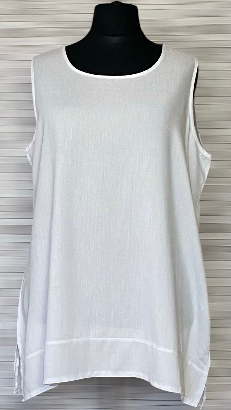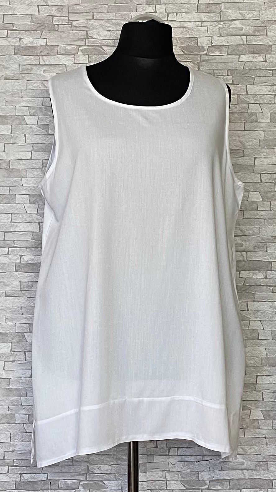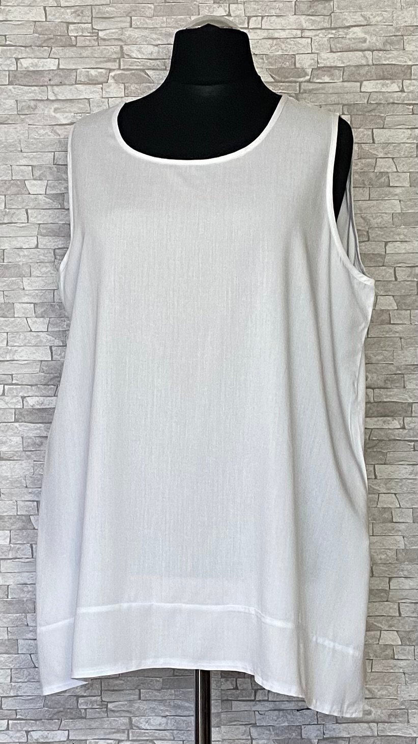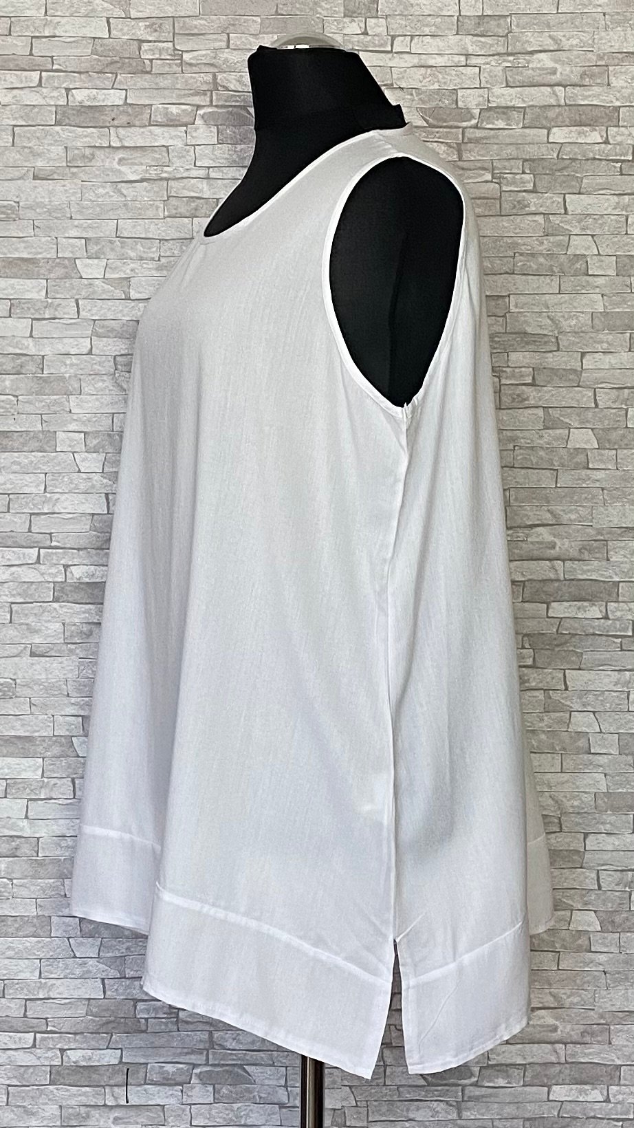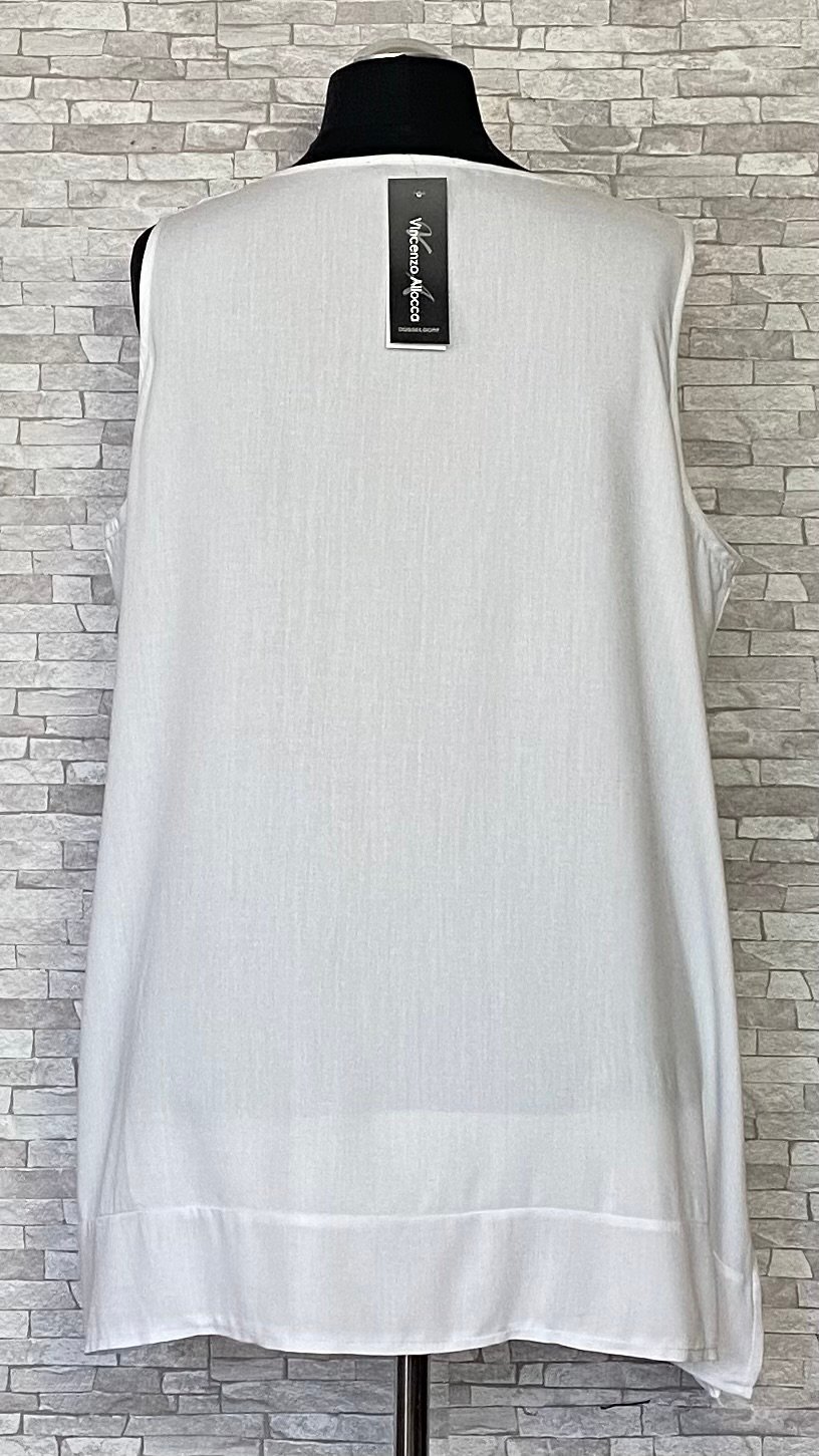 Biała bluzka marki Vincenzo Allocca wykonana z przewiewnego, wysokiej jakości materiału wiskozowego, który zapewnia lekkość i komfort noszenia. Model bez rękawów, o fasonie rozszerzanym ku dołowi, dzięki czemu swobodnie układa się na sylwetce. W dolnej części znajduje się poziomy, kryty szew – z przodu i z tyłu – który stanowi subtelny detal konstrukcyjny. Po bokach zastosowano niewielkie rozcięcia, zwiększające swobodę ruchów i wpływające na lepsze układanie się modelu. Uniwersalna propozycja – świetnie sprawdzi się latem jako lekka, elegancka bluzka, a także jako baza do wielu stylizacji przez cały rok.