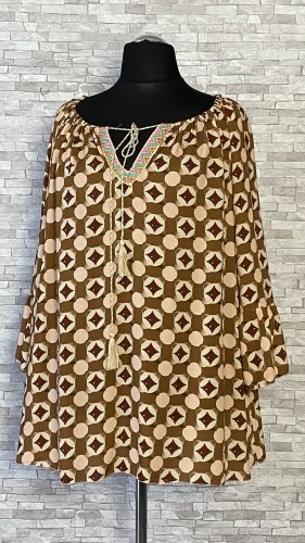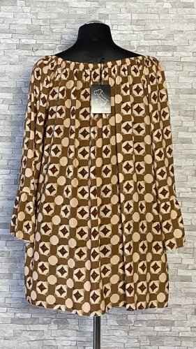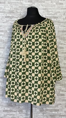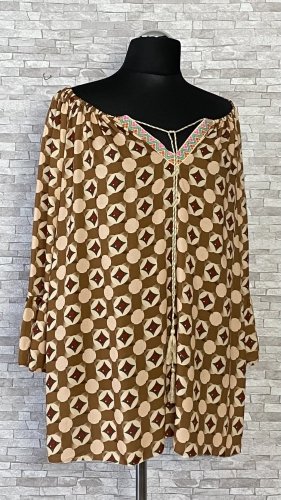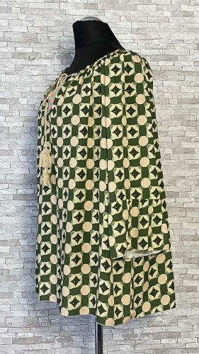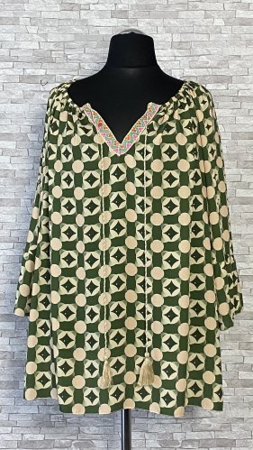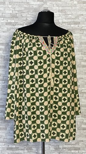 Bluzka typu hiszpanka, z gumką i wiązaniem przy dekolcie. Luźny model z raglanowymi rękawami, zakończonymi delikatną falbaną.