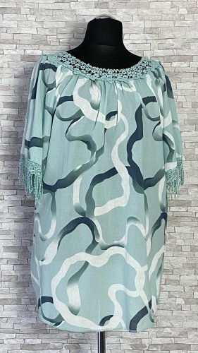 Luźna bluzka z koronką przy dekolcie. Model z szerokimi, raglanowymi rękawami zakończonymi efektownym, koronkowym pasem z delikatnymi frędzlami.