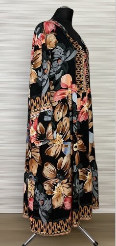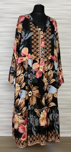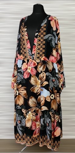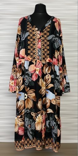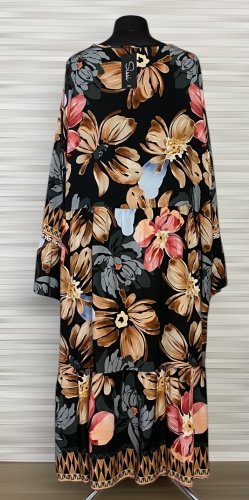 Efektowna sukienka maxi we wzory, uszyta z wygodnego i miękkiego materiału wiskozowego. Model z długimi rękawami, zakończonymi delikatną falbaną. Sukienka z dekoltem w szpic, w górnej części zapinana na guzki.