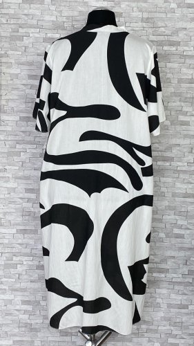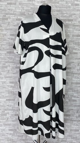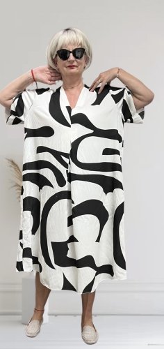 Biała sukienka w czarne wzory, z dekoltem w szpic i delikatną zakładką na przodzie. Model o kroju litery A, z krótkimi, szerokimi rękawami.